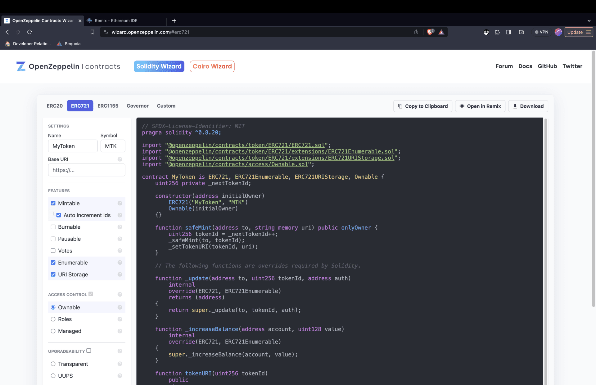 As with the ERC-20 section, the base contract MyToken is deriving the ERC721 contract, which contains the logic necessary for a functional ERC-721 token contract. MyToken, in essence, allows us to define the initial values of our ERC-721 token. Just like the ERC-20 contract, we can also inherit optional features for our ERC-721 token as well. Below is an example of us customizing our ERC-721 token: